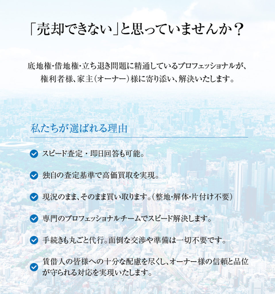 株式会社ユニバーサルバンクでは、こうした底地・借地権の買取に特化し、地主様・借地権者様双方の立場に寄り添った最適な解決をスピーディにご提案しています。