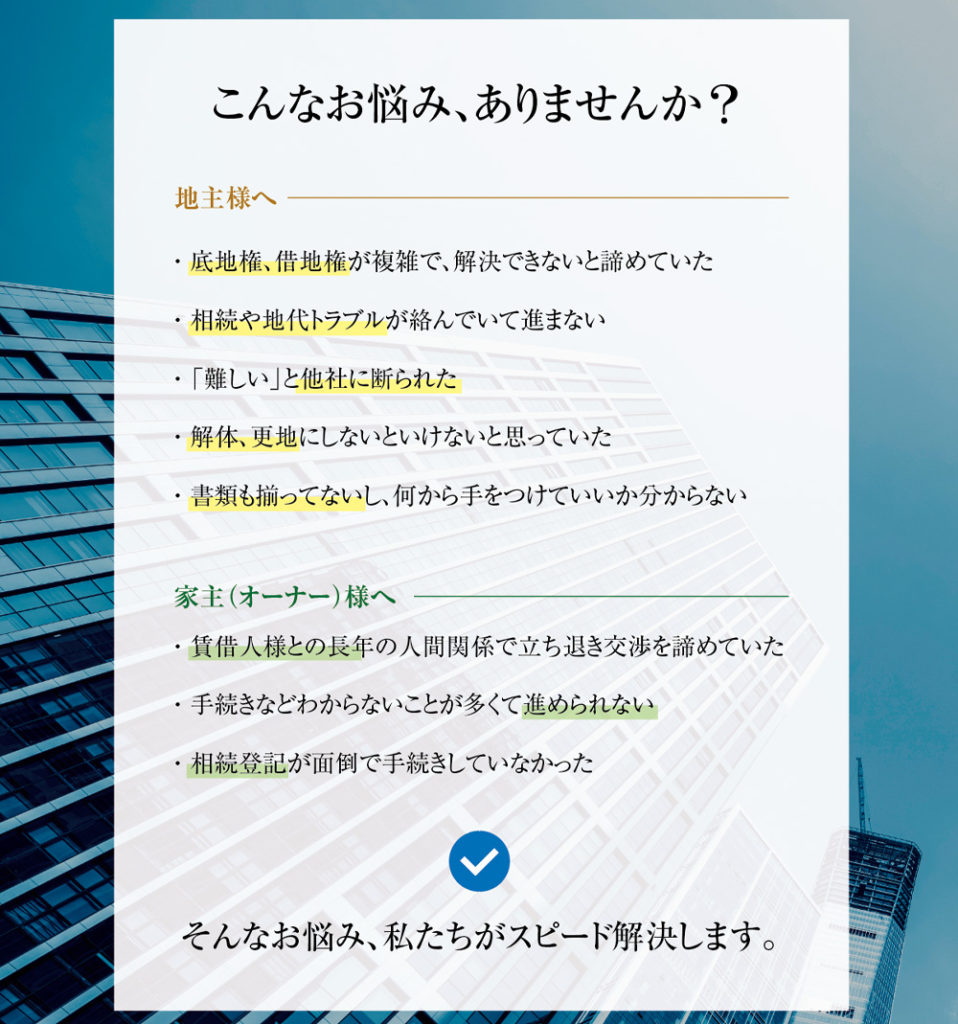 借地権を所有されている方も、売却や譲渡にあたって地主様との交渉や条件調整にお悩みの方が多くいらっしゃいます。